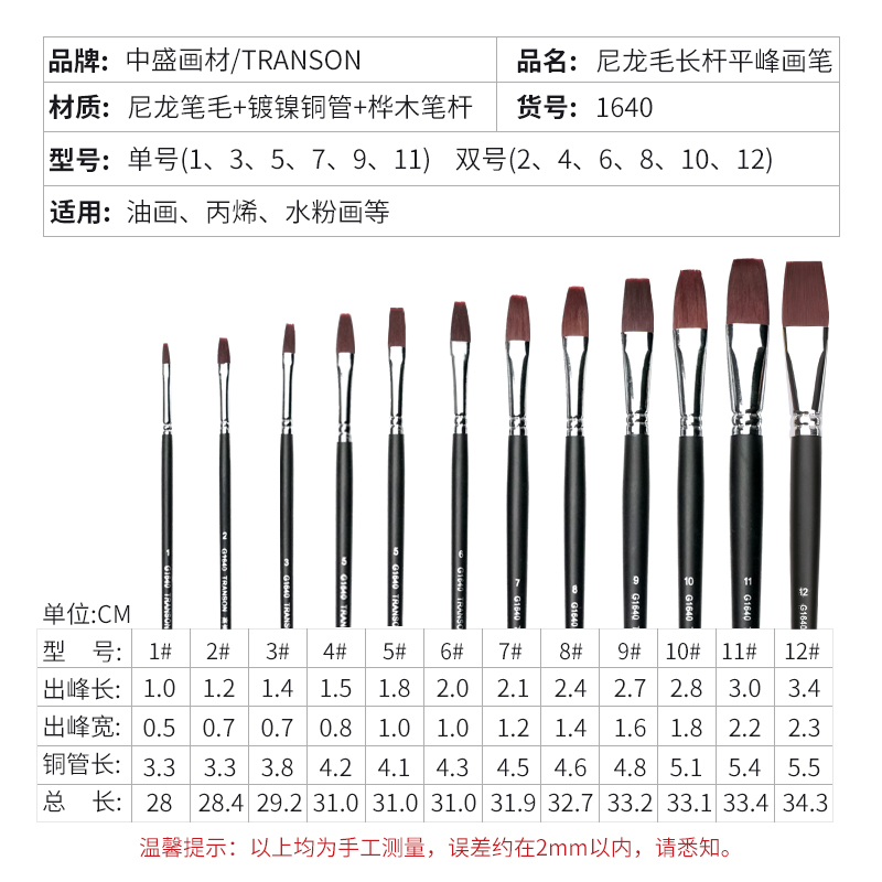 Zhongsheng painting material 1640 single number set 6 pcs Nylon hair long pole flat peak brush Oil painting Acrylic watercolor gouache
