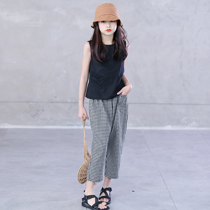 Children's clothing 2022 summer Korean style girls' foreign style loose harem pants plaid cropped pants middle and big children's pure cotton casual pants