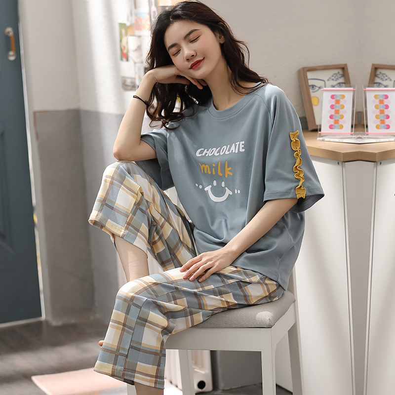 Pajamas ladies summer cotton short sleeve pants thin spring and autumn Korean version of sweet and cute can wear home clothing suit