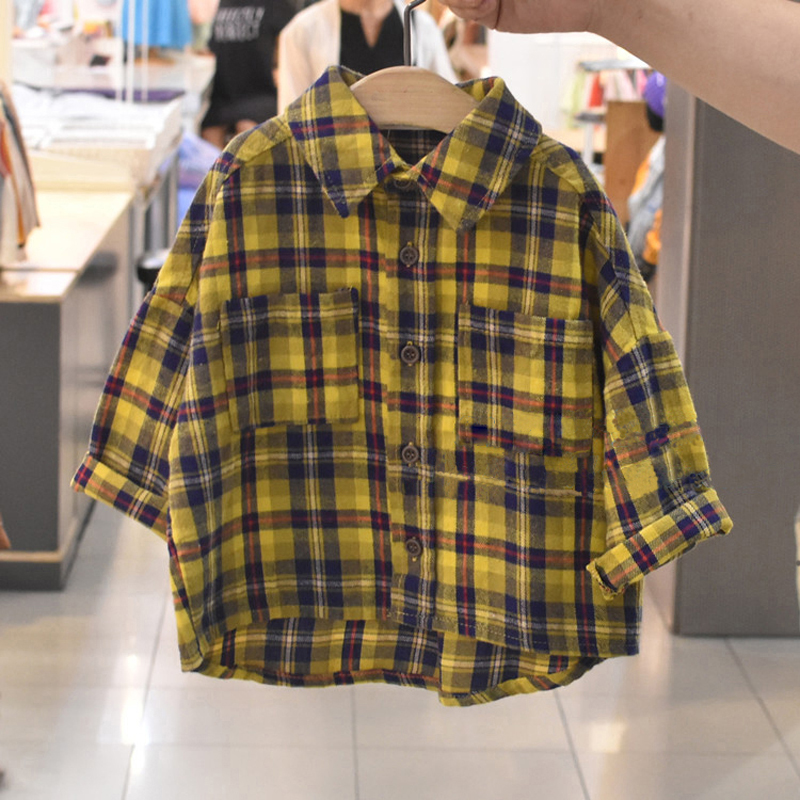 Korean children's clothing spring and autumn Korean style fashionable boys and girls cotton linen plaid shirt children's shirt baby bag pants suit