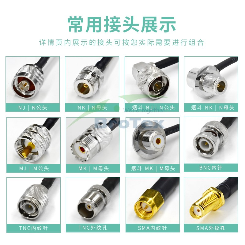 1 Feeder Connector - N Male 2 Feeder Connector - N Female 3 Feeder Connector - M Male 4 Feeder Connector - M Female 5 Feeder Connector - SMA Inner Striating Needle 6 Feeder Connector - SMA Inner Striated Hole 7 Feeder Connector - SMA External Thread Needle 8 Feeder Connector - SMA External Thread Hole 9 Feeder Connector - TNC Male - Inner Needle 10 Feeder Connector - TNC Inner Thread Joint 11 Feeder Connector - TNC External Thread Needle 12 Feeder Connector - TNC External Thread Hole 13 Feeder Connector - BNC Male 14 Feeder Connector - BNC Female There is no corresponding combination, take a note