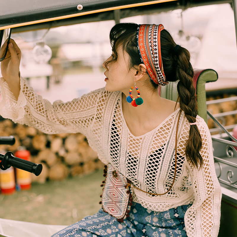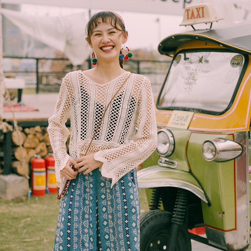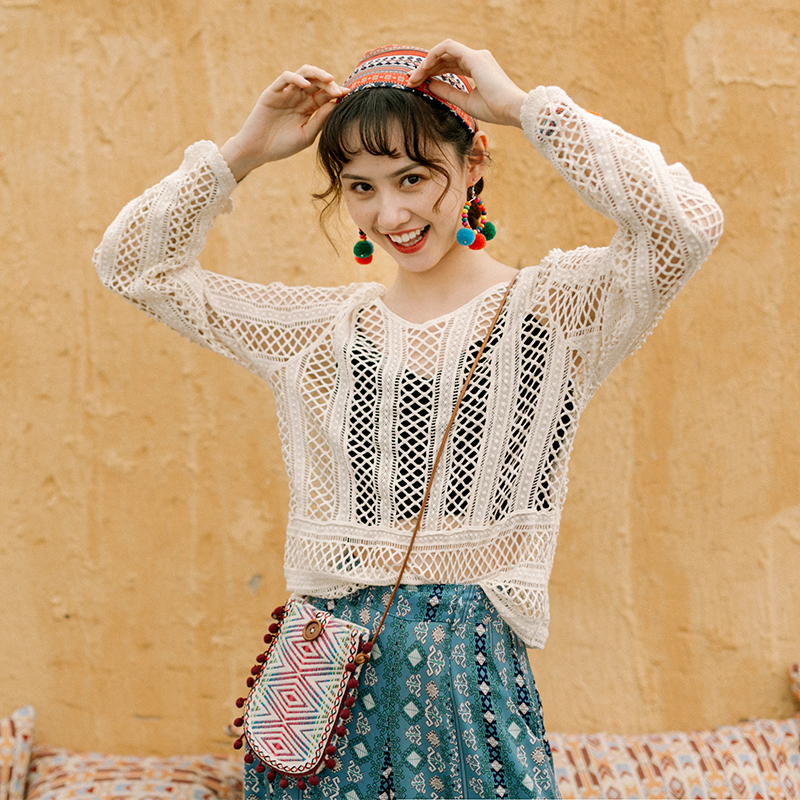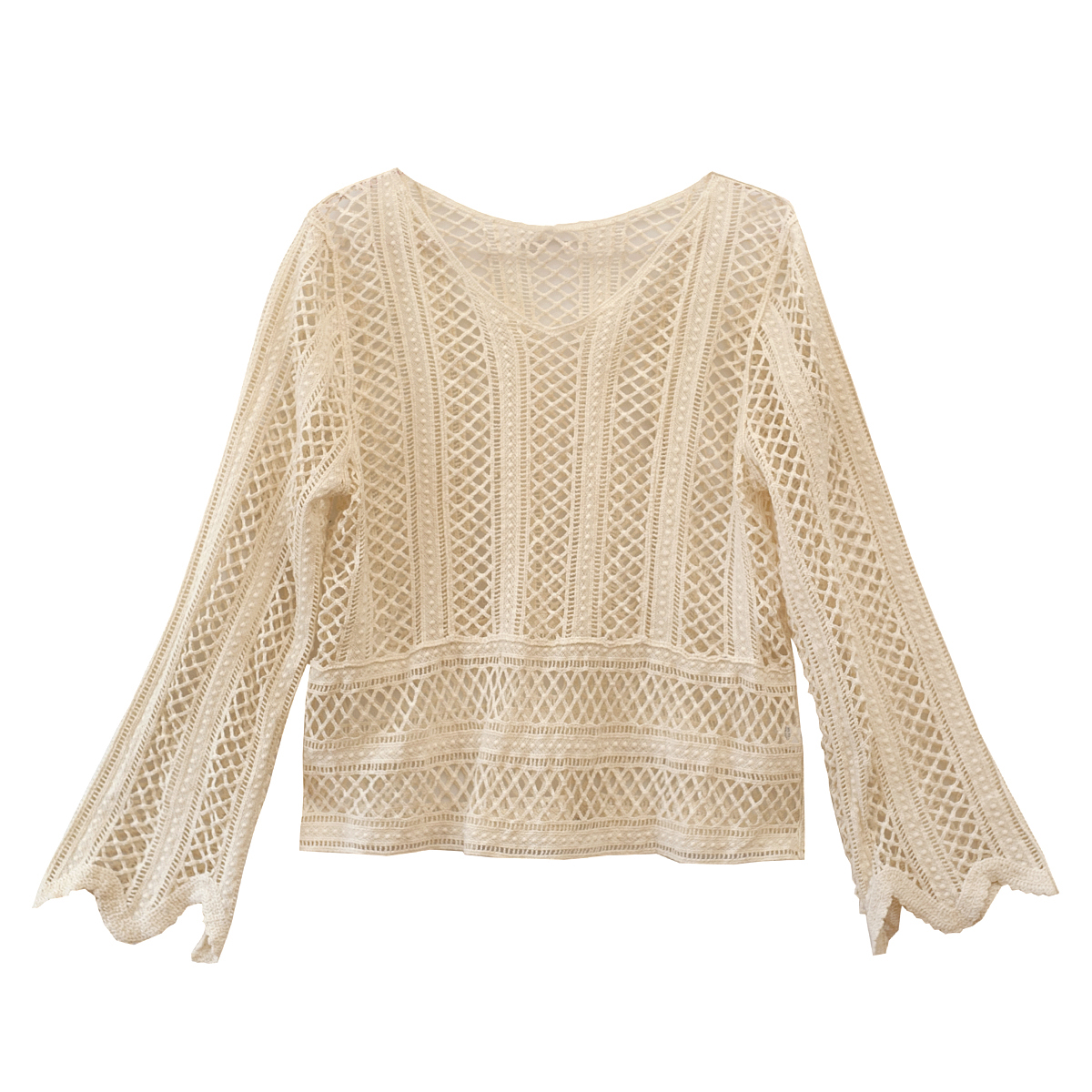 Knit Hollowed-out Long Sleeve Sunscreen Sweatshirt Loose V collar Outer lap Short Thin Blouse Women's Foreign Pie Holiday Thin