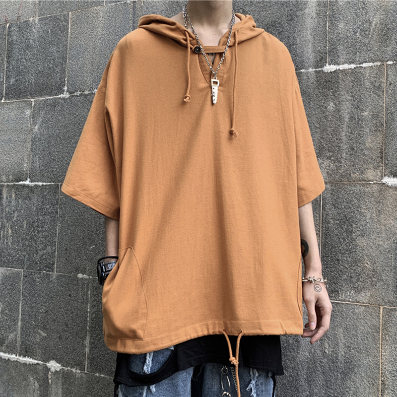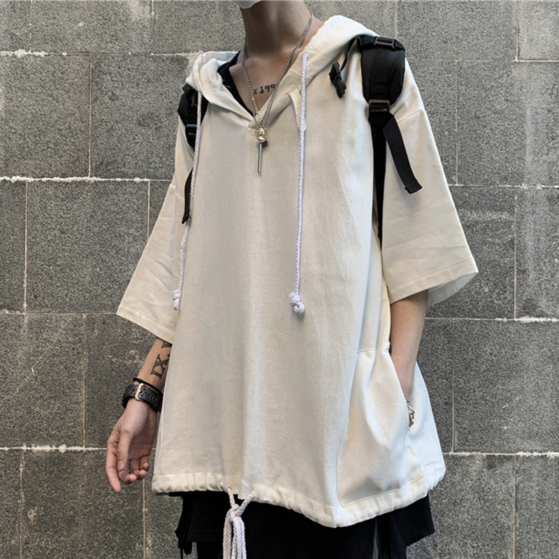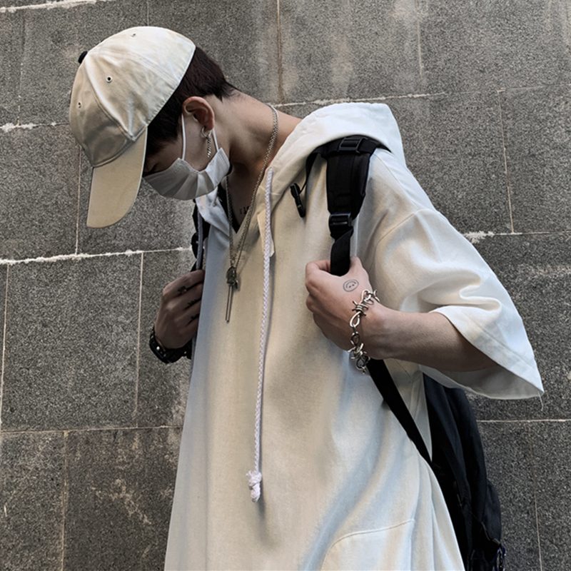 INSstudios South Korea Ins Summer Trend Dark Black Ensemble High Street Tie Caps Loose short sleeves T-shirts Men and women