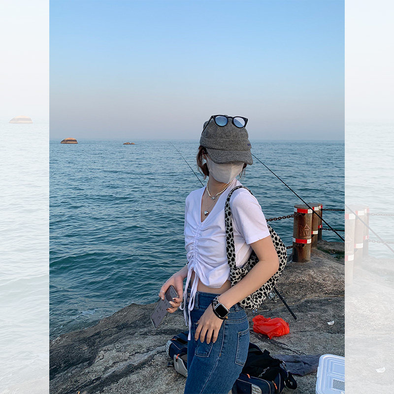Seven4lee Xiaohong design sense white drawstring V-neck top women's summer short bm high waist navel short-sleeved T-shirt