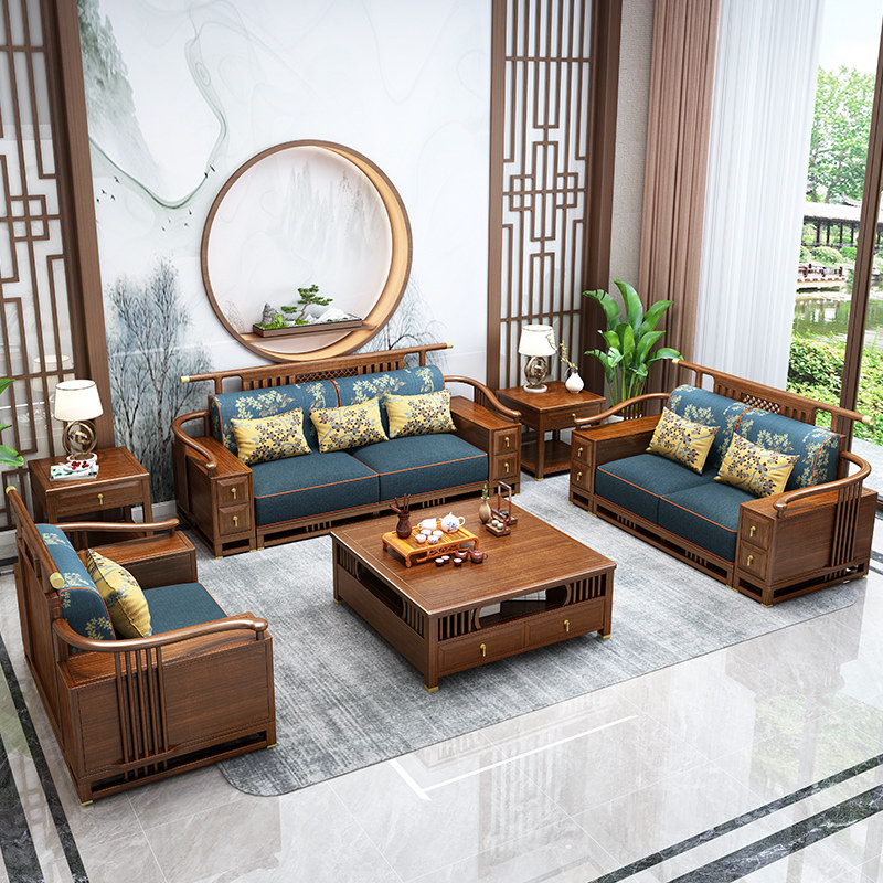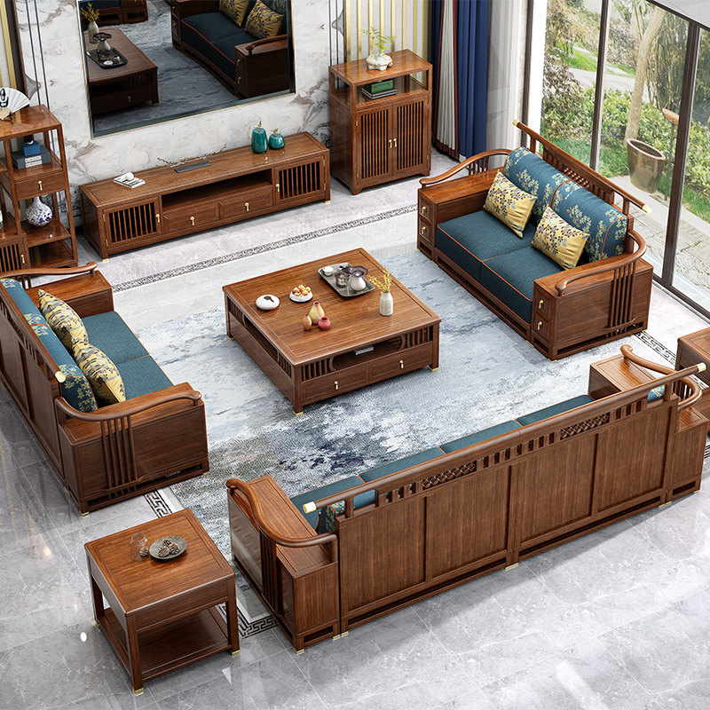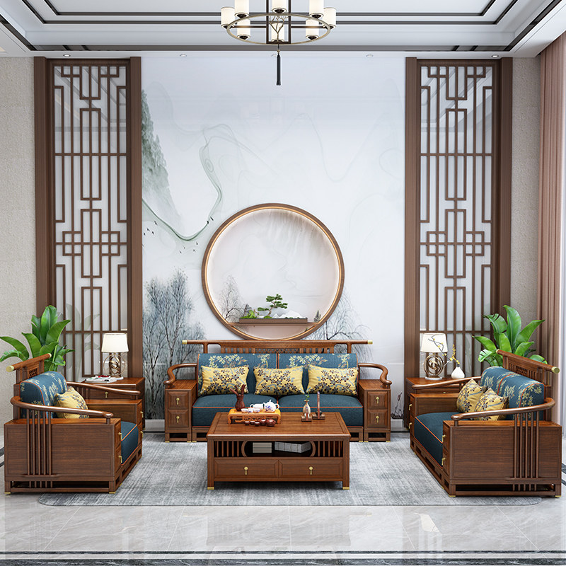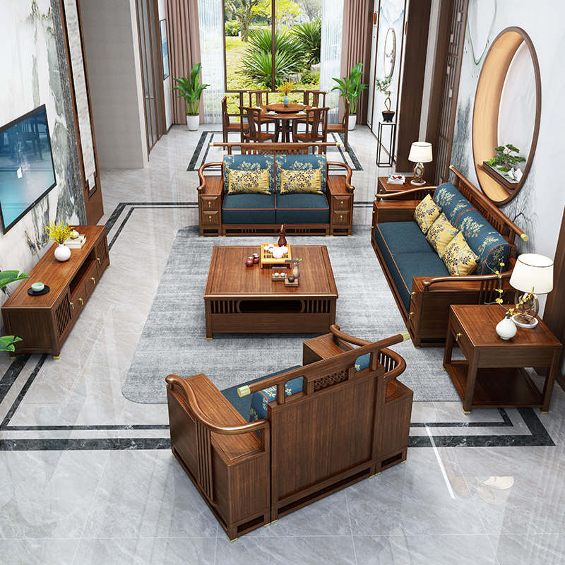 New Chinese-style living room combination furniture Chinese style gold silk sandalwood Zen villa large-sized storage solid wood sofa