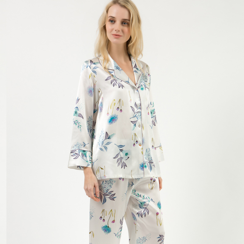 Hares Spring Autumn Real Silk Sleepwear Woman Printed Summer Two Sets Silk Long Sleeve Thin 100% mulberry silk Home Residence Clothes
