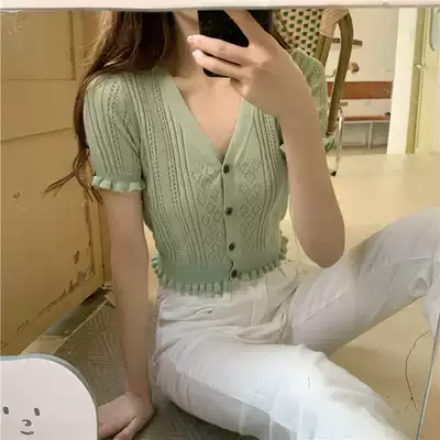 Short slim top female 2021 New Net Red large size women's Korean version of V collar Dew navel knitted shirt short sleeve summer