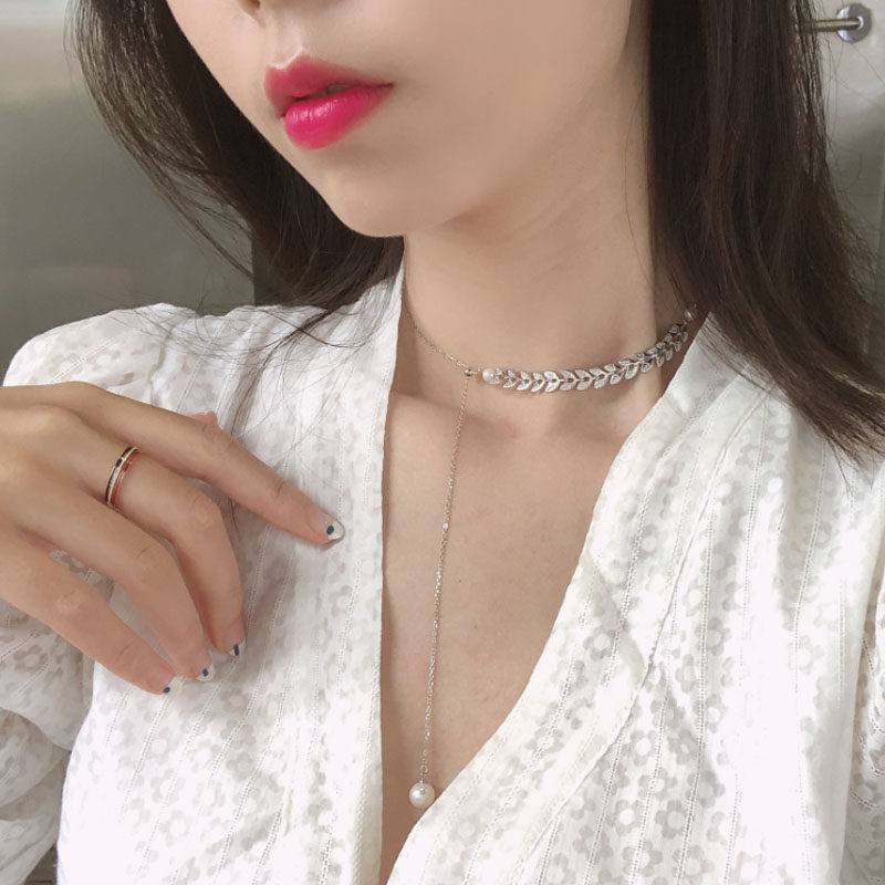 Pearl leaf necklace female 925 sterling silver ins cold wind hypoallergenic Short chain Niche luxury high sense collarbone chain