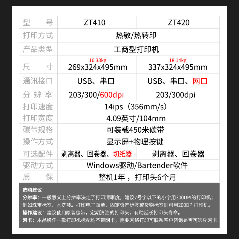 ZT410(203dpi)ZT410(300dpi high precision version)ZT410(600dpi ultra HD)ZT420(203DPI) conventional