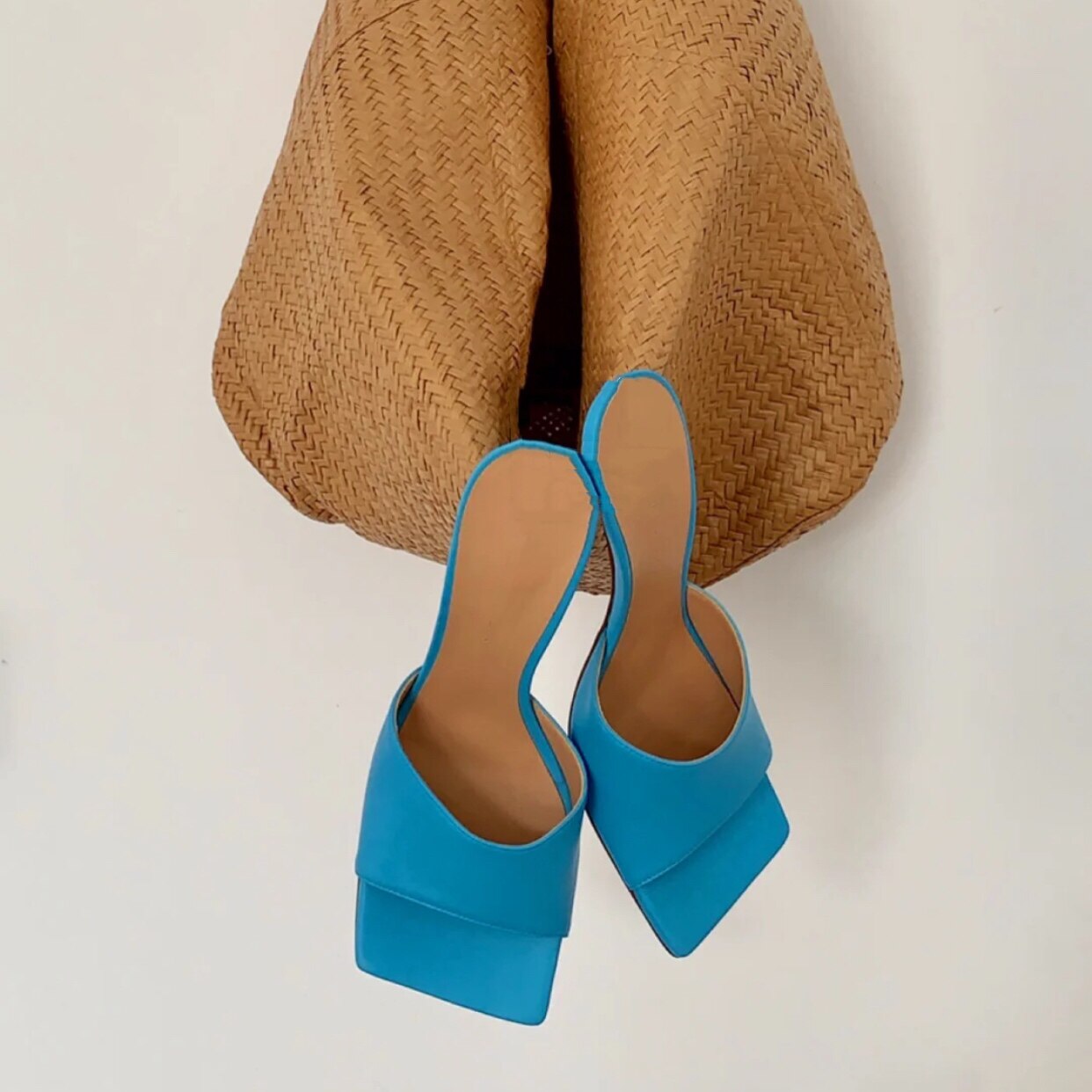 Senior, B net red identical V ~ square head blue fine heel high heel external wearing sandal leather trendy European and American sandslipper shoes