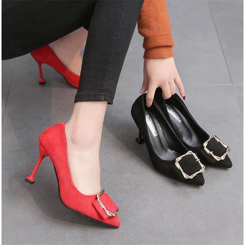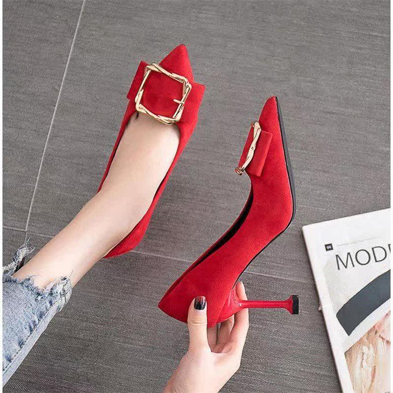 High Heel Shoes Women's Slim Heels Children Student Han Edition 2019 New Metal Square Button 100 Hitch Wrap Shoes Woman