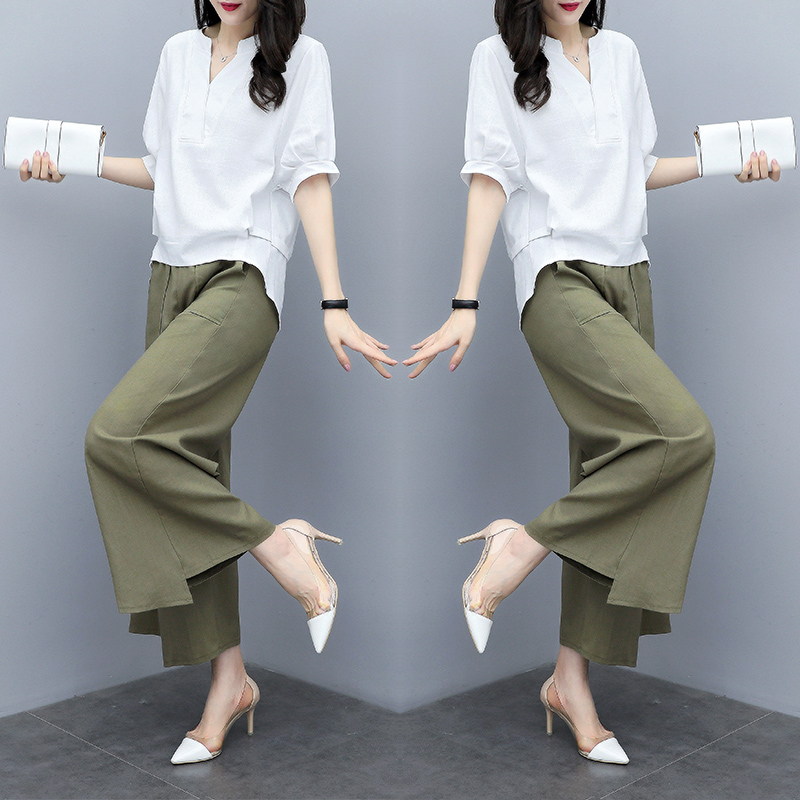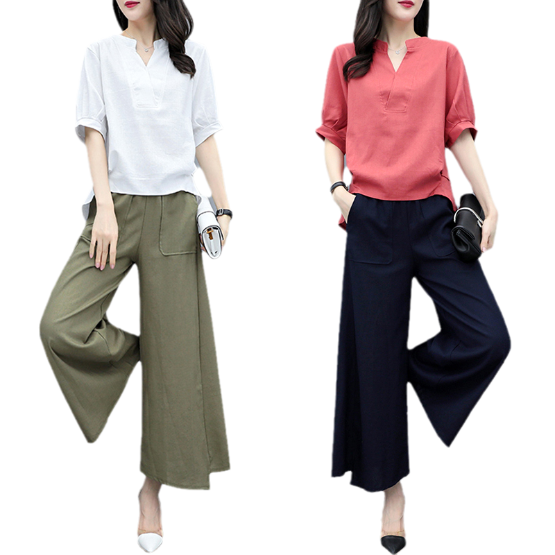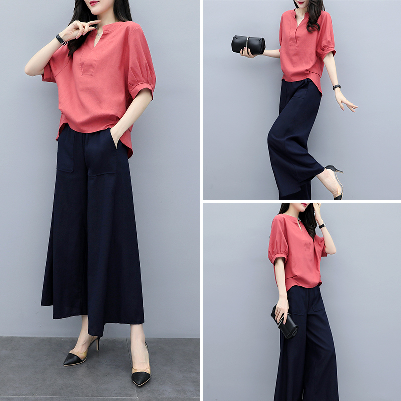 2022 summer new large size fat mm cotton and linen suit women cover the stomach to show thin casual wide pants linen two-piece suit