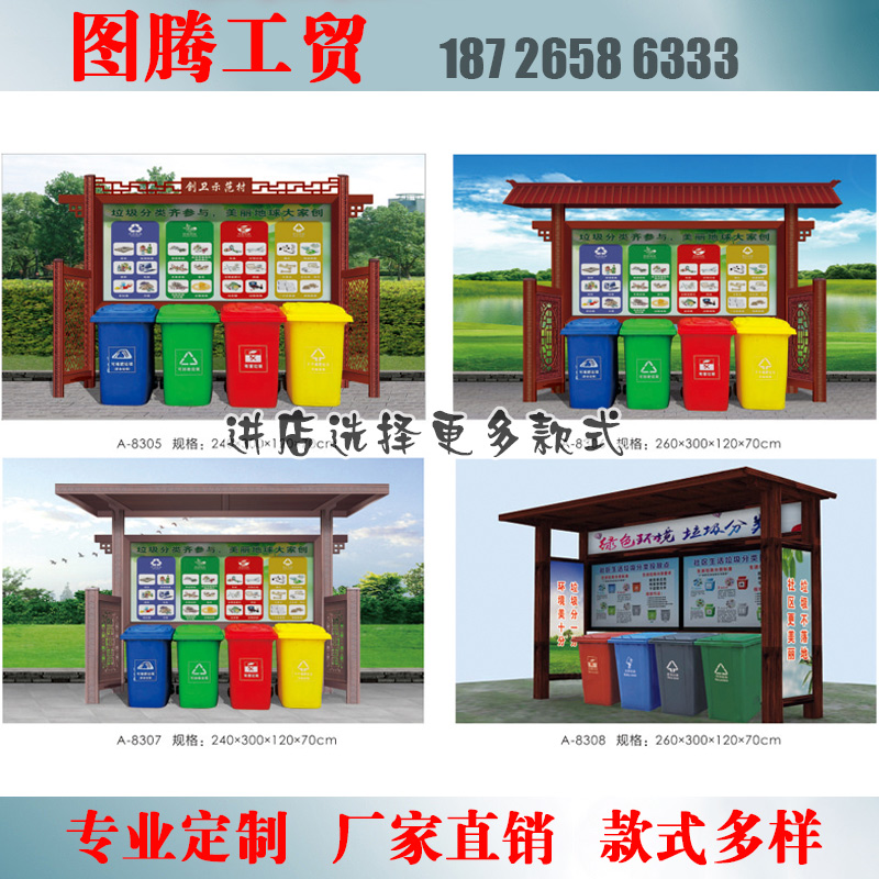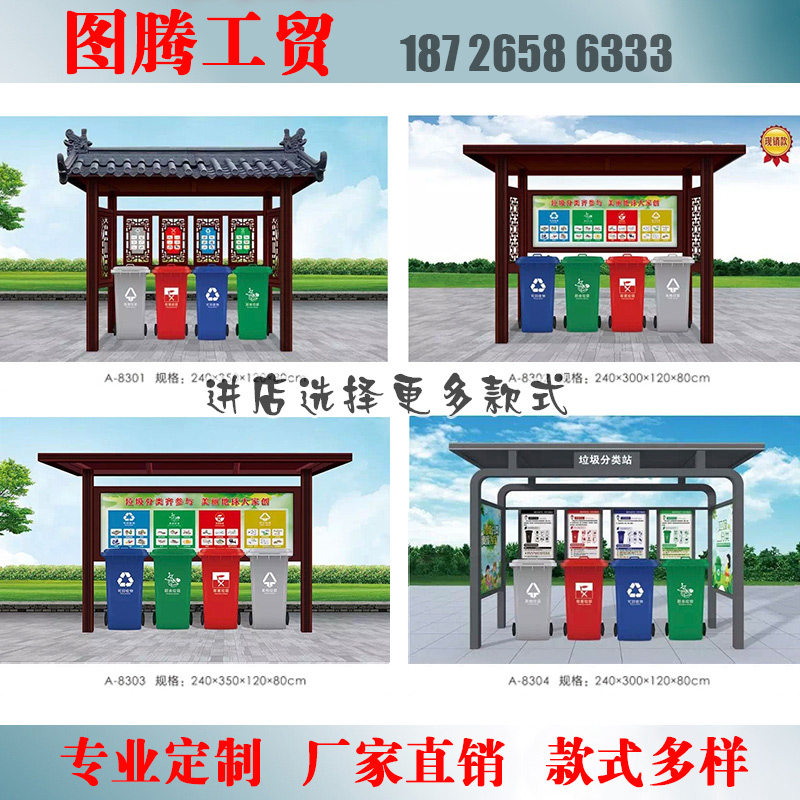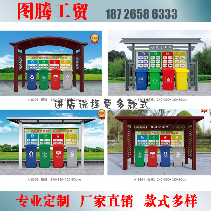 Outdoor community garbage sorting kiosk Garbage recycling station Wrought iron awning shed garbage collection station City publicity board