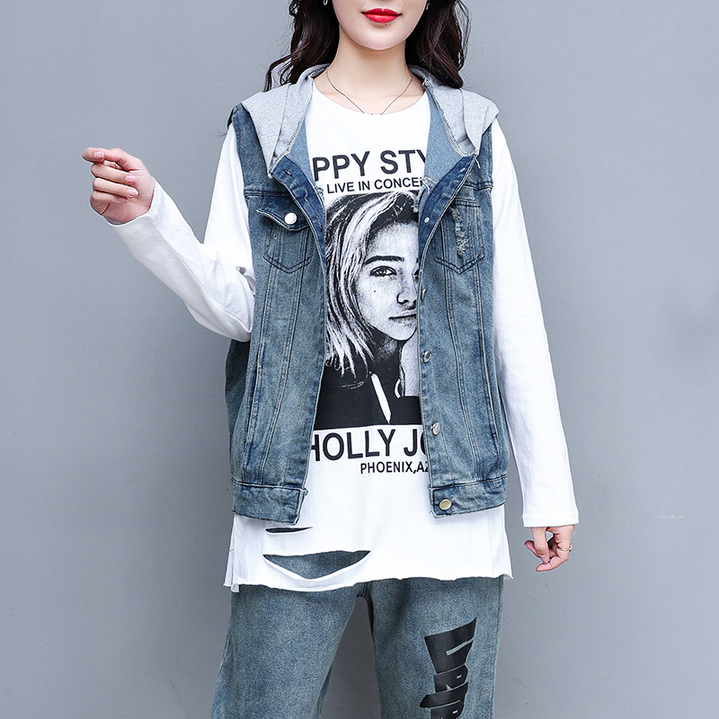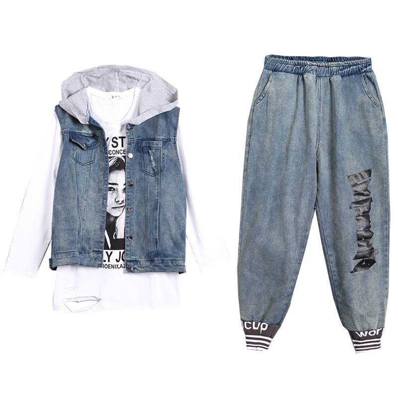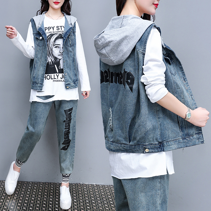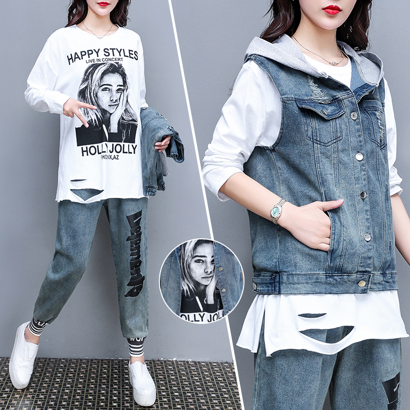 Fat Sister Spring Autumn New Denim Casual Suit Big Size Women's Dress Foreign Pie minus Aging Shade and Slim Two Sets