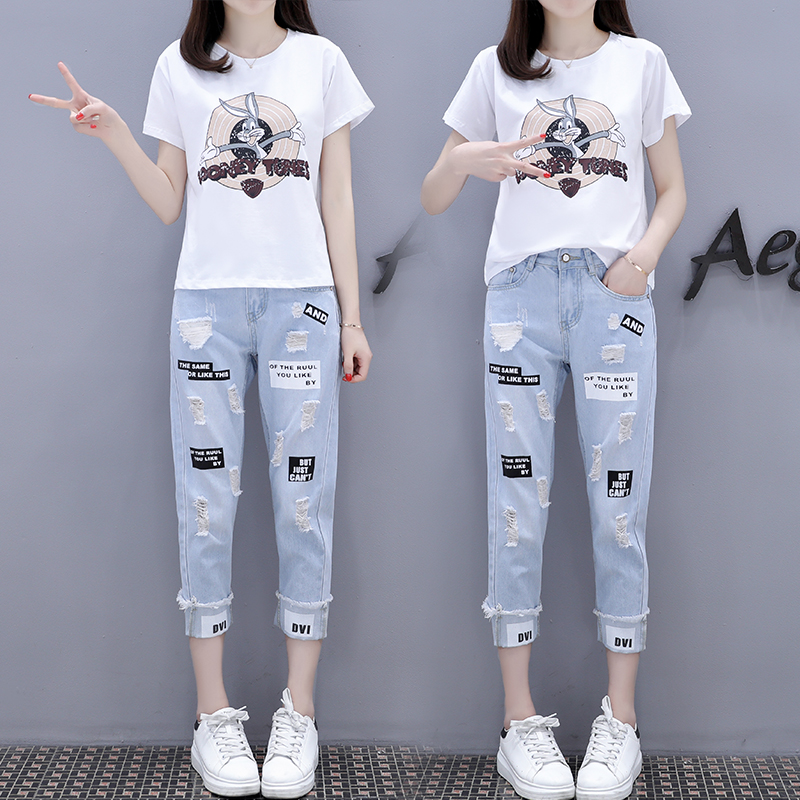 Large size women's dress 2022 Summer new trendy minus-age fat mm Slim Cover Tummy T-shirt Jeans Two-piece Style Suit