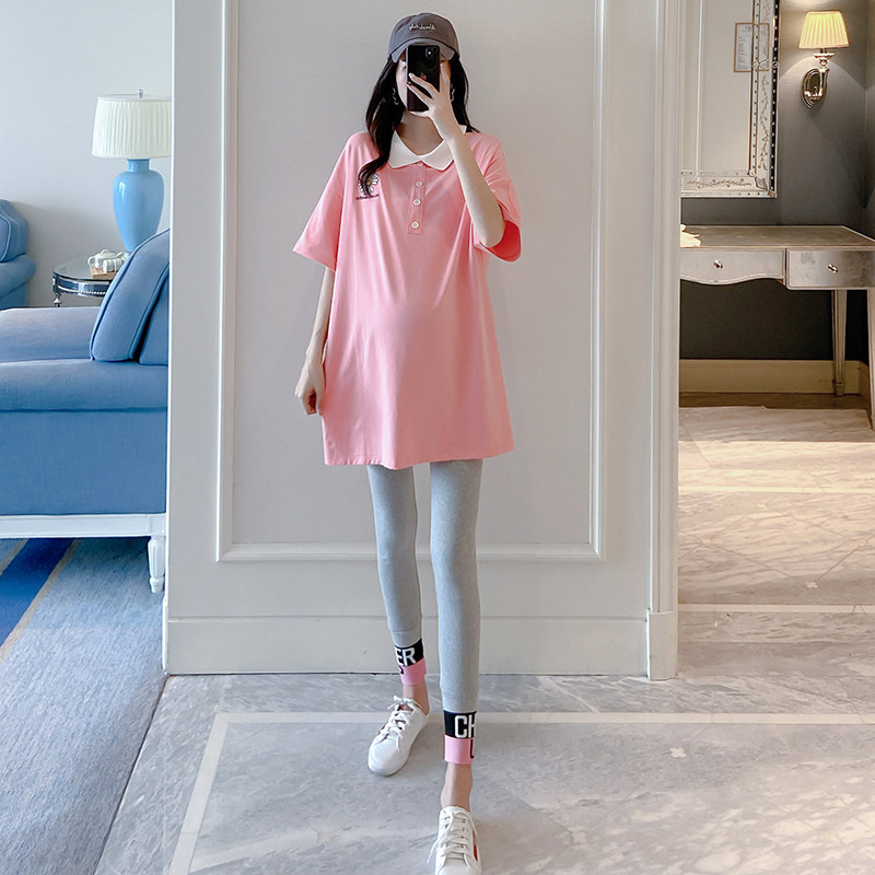 Pregnant women lapel T-shirt long version of Korean tide mom fashion 2020 personality lapel T-shirt shirt short sleeve