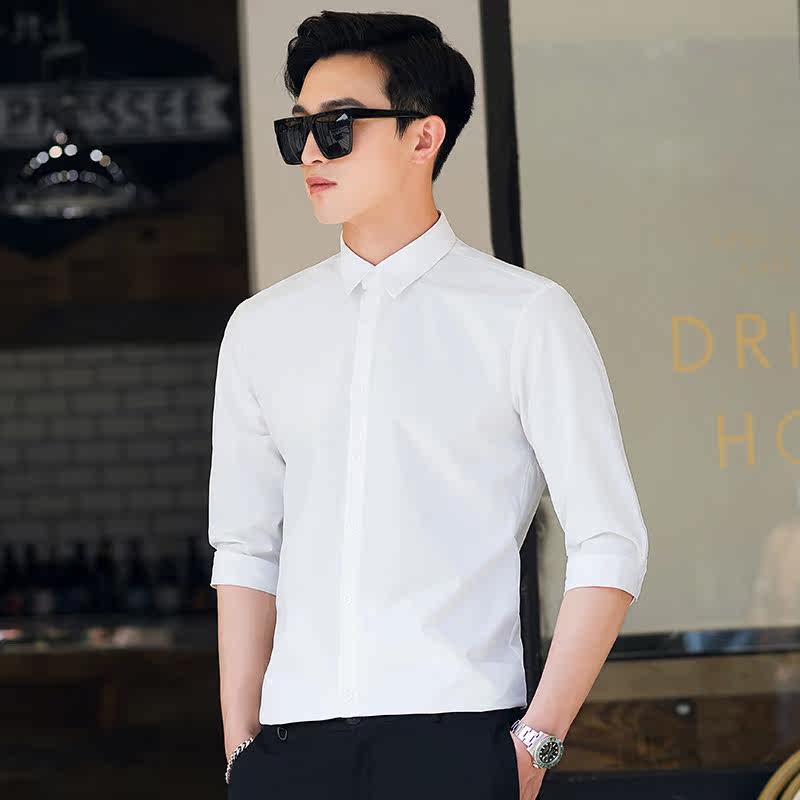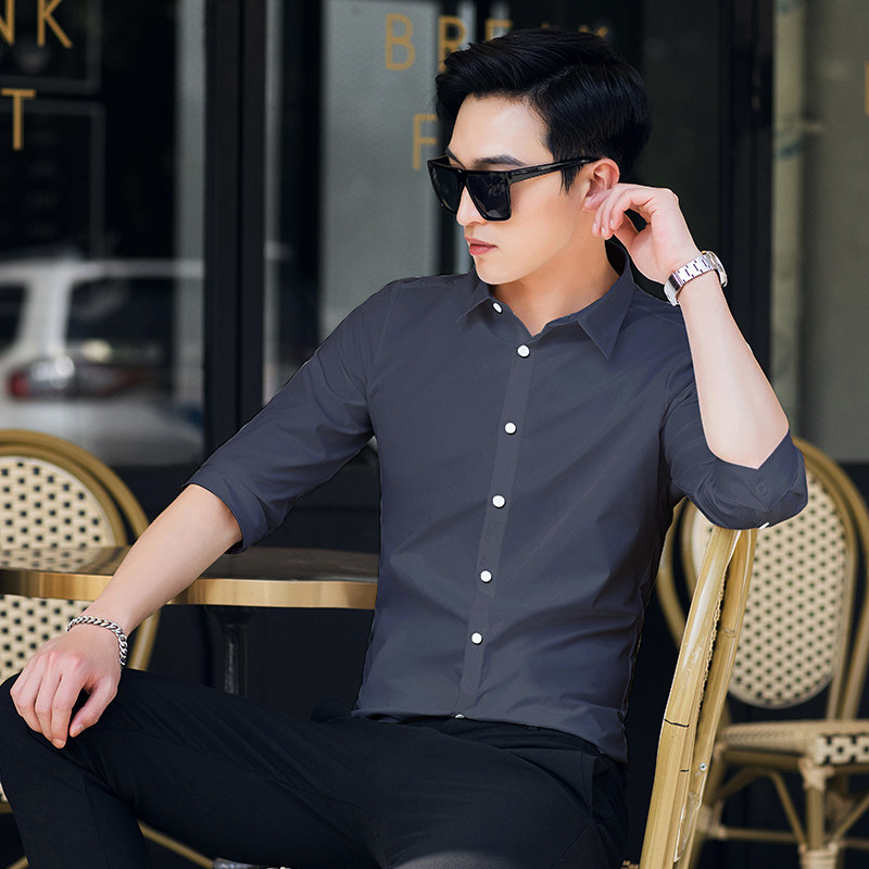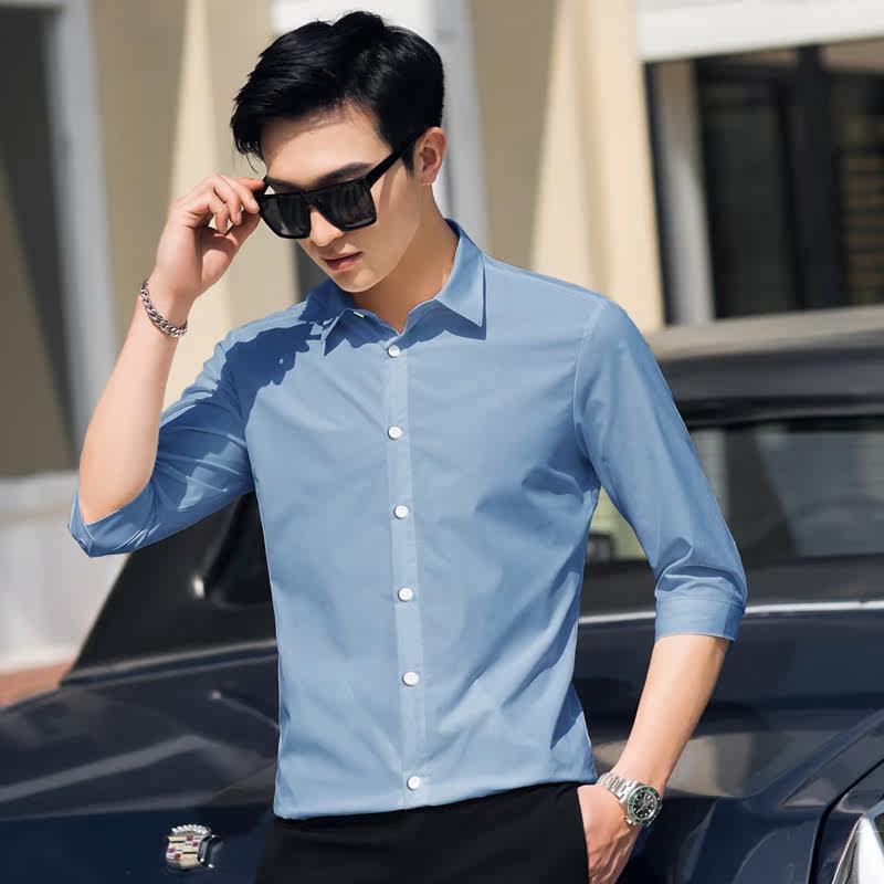 OECANA2021 summer casual five-point sleeve shirt Men's shirt Slim solid color ruffian handsome shirt seven-point sleeve shirt