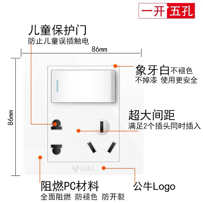 Bull one open five holes with switch socket panel household 86 type concealed wall 10a power socket 5 eyes