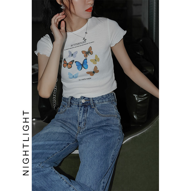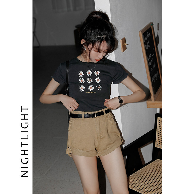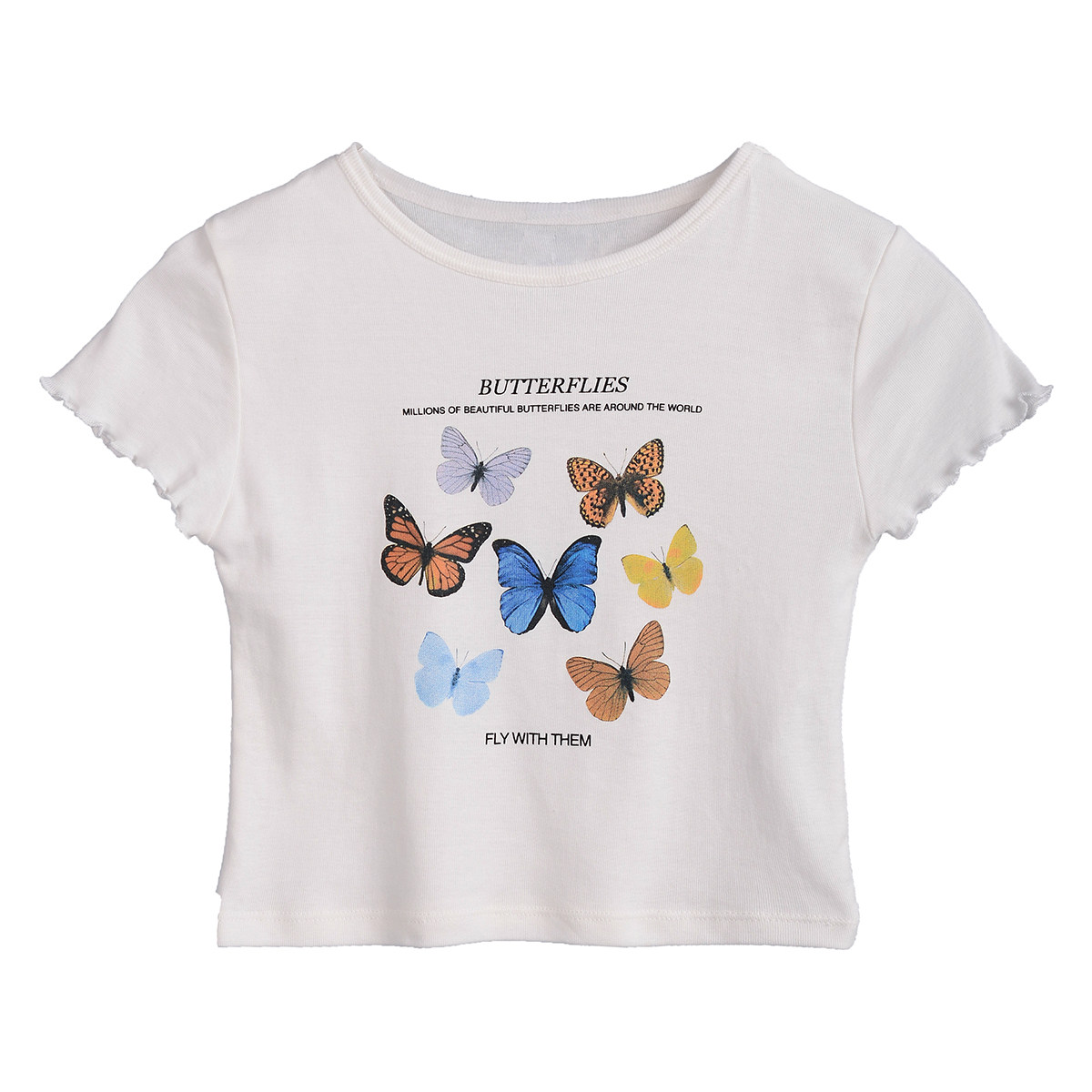 Short Sleeve T-Shirt Woman Summer New Pure Cotton Dew Navel Chicks Print Inside the bottom Shirt Tide Body Short blouses
