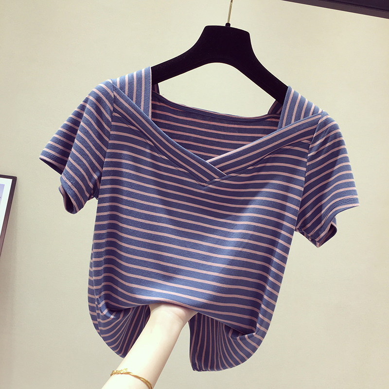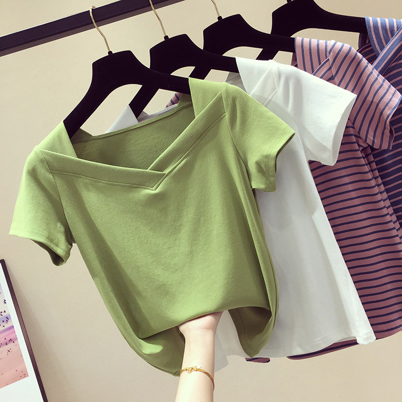 Korean Bull Oil Fruits Green V Neckline Short Sleeve Woman T-Shirt 2020 Spring Summer New Half Sleeve Short jacket temperament 100 lap