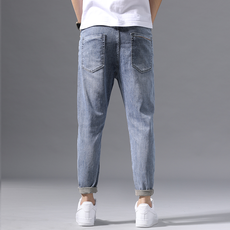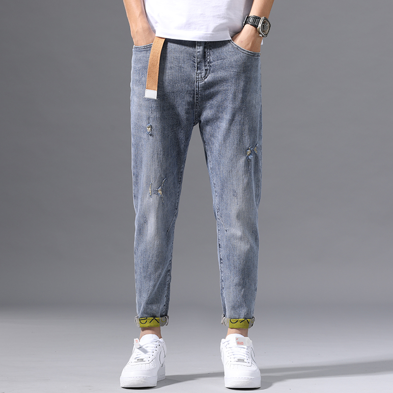 Hong Kong high-end jeans men's Tide brand spring/summer 2020 hole elastic slim feet light color long pants