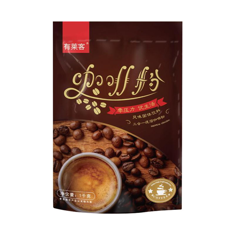 There are Laike three-in-one instant coffee powder bag 1kg catering commercial milk tea coffee machine raw material promotion