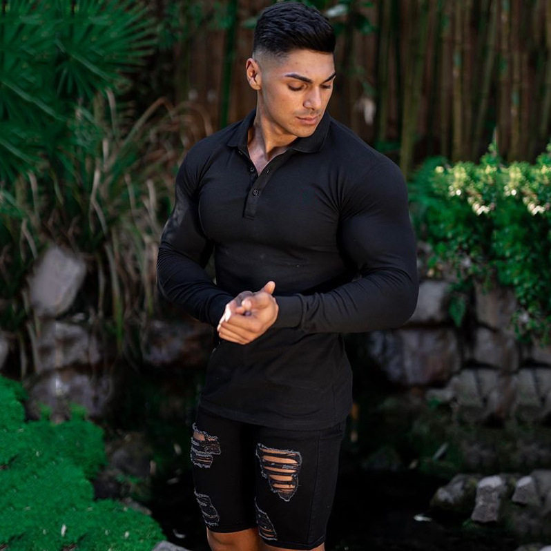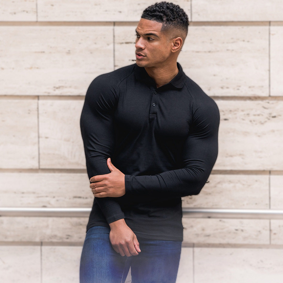 Muscle European and American POLO shirt men's new sports long-sleeved lapel quick-drying men's fitness tights running training clothes