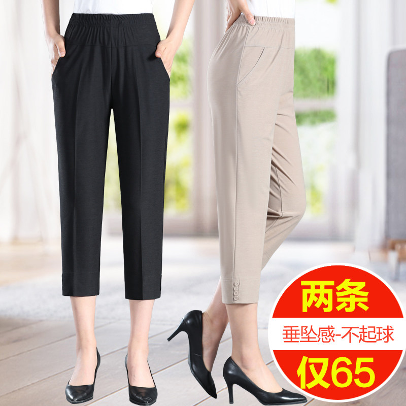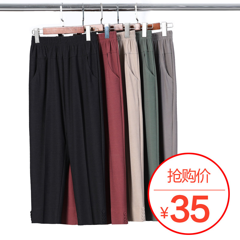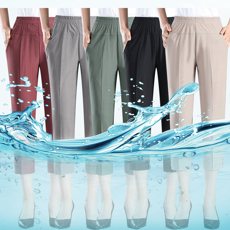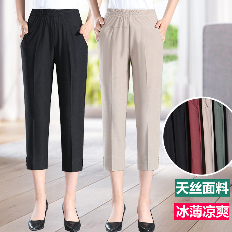 Middle-aged women pants summer thin seven points pants mother pants elastic waist ice silk pants loose straight pants for the elderly