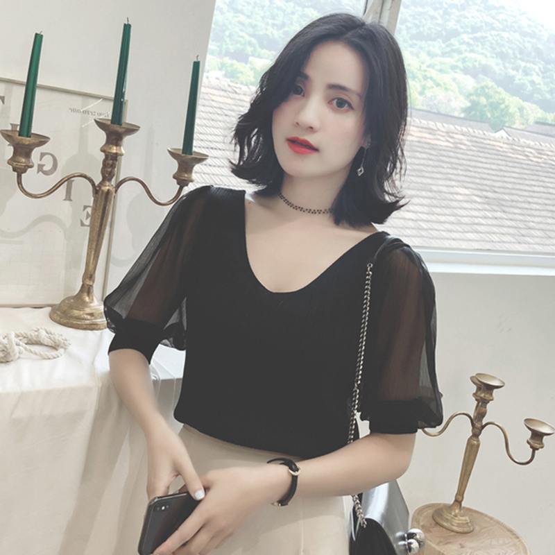 2021 summer knitted short-sleeved white V-neck T-shirt women's loose short ice silk sweater thin section bubble sleeve top