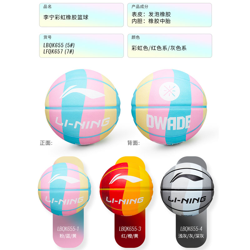Li Ning Rainbow Basketball No. 7 Adult Wearable Competition Student Kindergarten 5 Children Rubber Basketball LBQK657