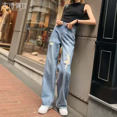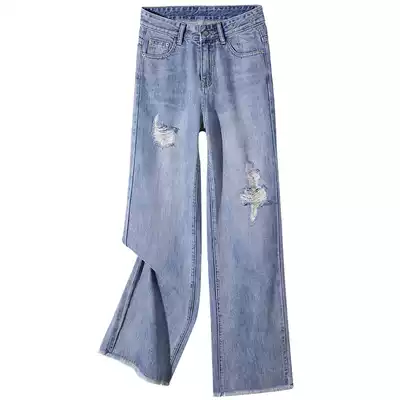 High-waisted hole wide-legged jeans women's spring and autumn 2021 New hanging loose straight pants thin mopping pants