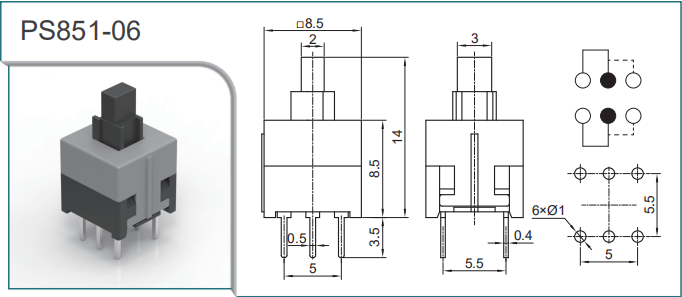 8 5*8 5*14 self-locking switch key switch 8 5X8 5 lock-free button double row six-pin straight plug-in cap