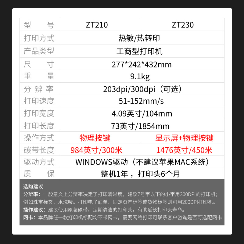 ZT210 (203dpi)ZT210 (300dpi high precision version) ZT230 (203dpi with screen) ZT230 (300d)