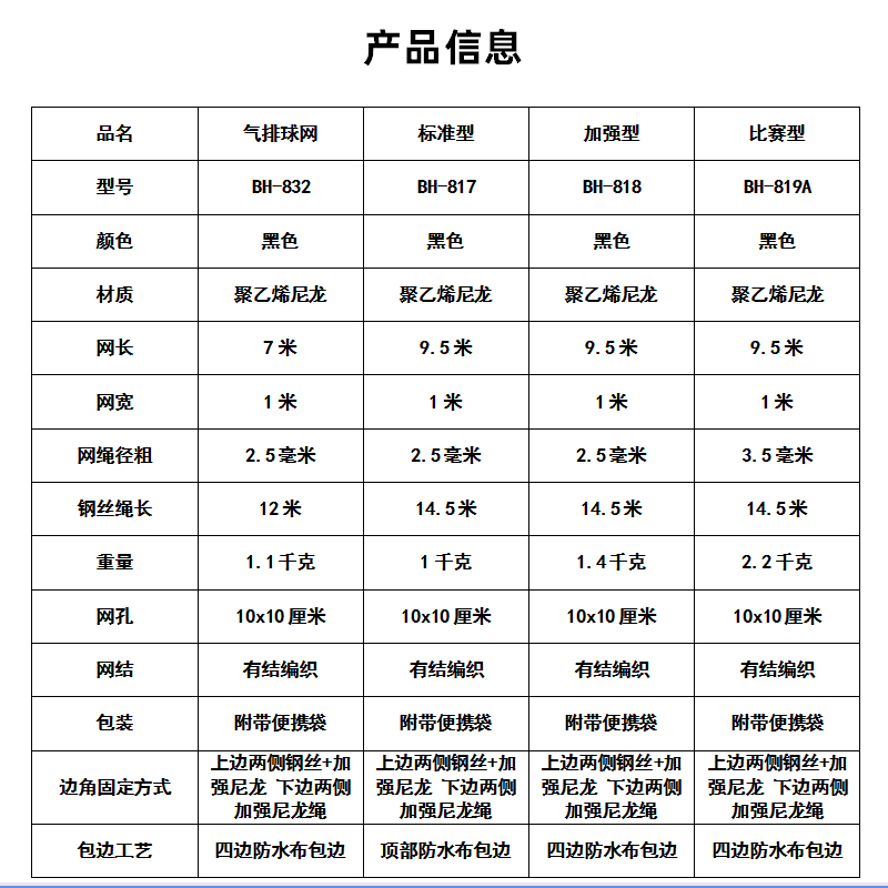 BH-832 BH-817 Standard Volleyball Network BH-818 Enhanced Volleyball Network BH-819A Competition Volleyball Network