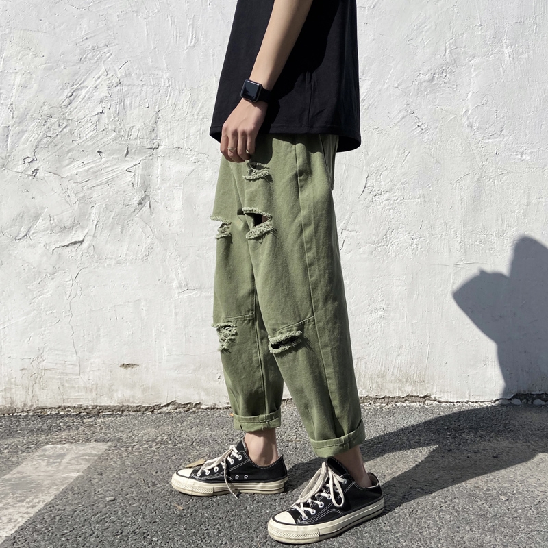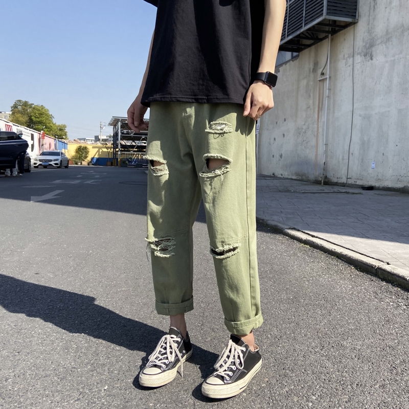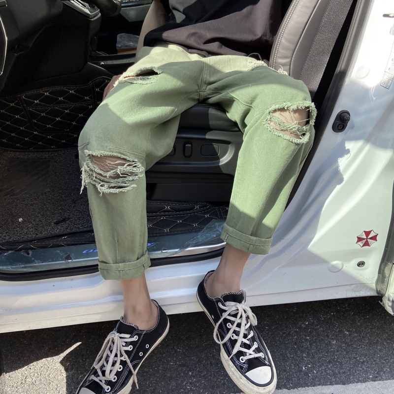 Broken jeans men's straight loose nine-point tide brand trend ins Hong Kong style Joker summer beggar pants thin