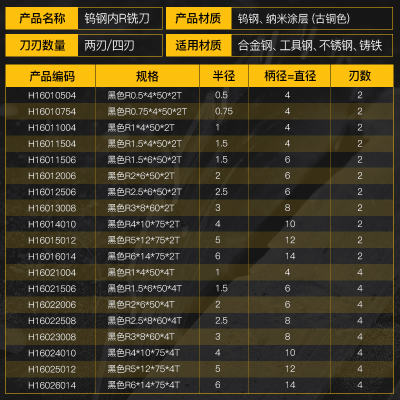Inner R milling cutter R0 5*4*50*2T Inner R milling cutter R0 75*4*50*2T Inner R milling cutter R1*4*50*2T Inner R milling cutter R1 5*4