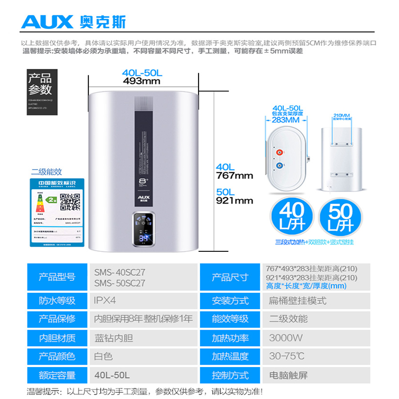 Ox Erect flat barrel water heater Electric home make-up room ultra-thin small 40 l 50 liters water storage bath