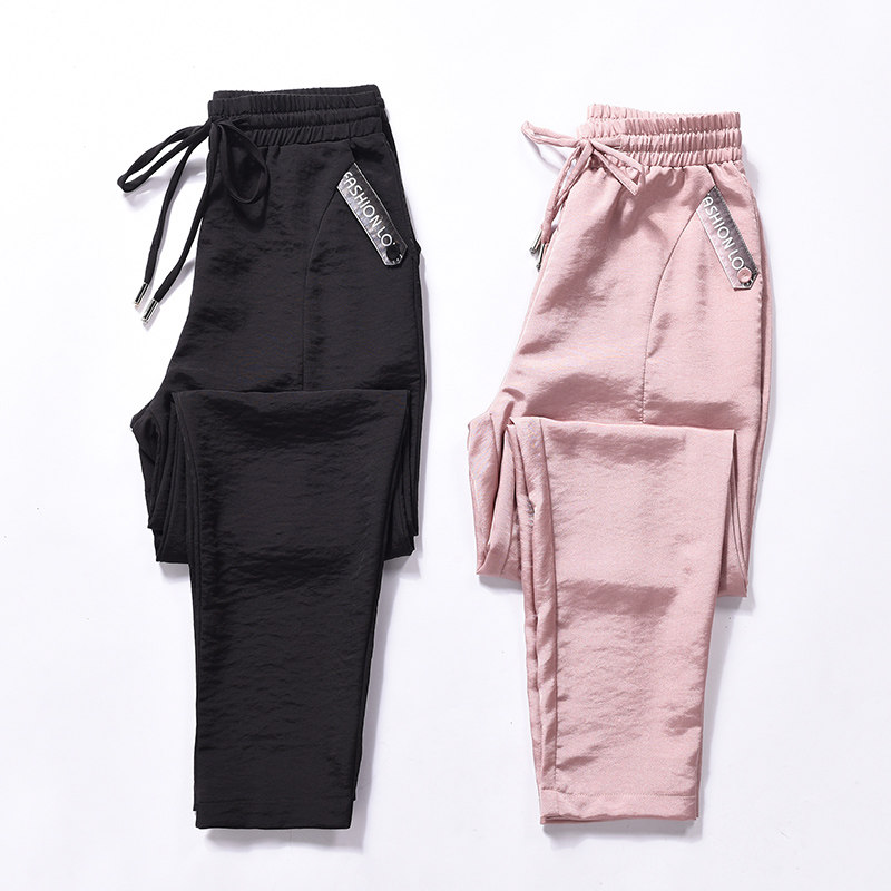 South Korean thin ice silk casual pants women pink summer 2021 new loose bunches 100 hitch-nine sports pants tide