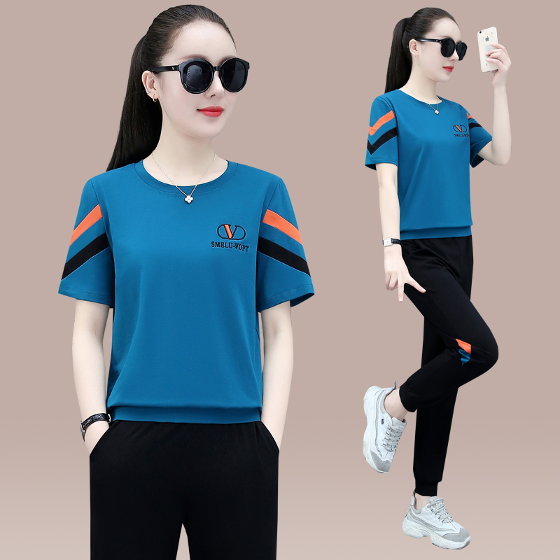 Sport suit Women in summer 2022 New fashion round collar loose with slim short sleeves Straight tube long pants reduced by two sets