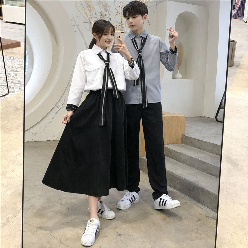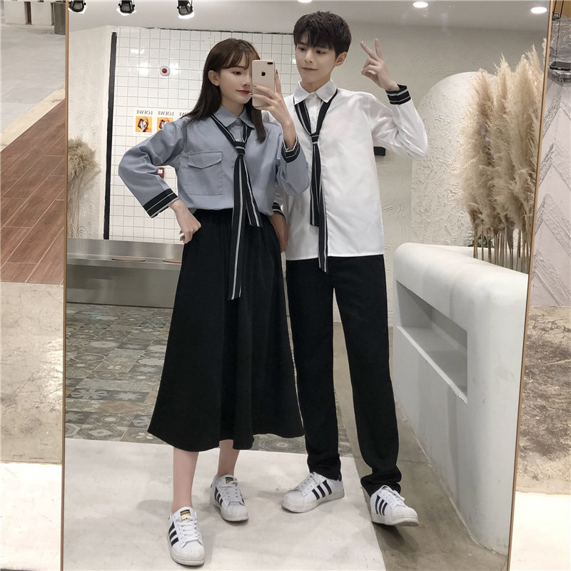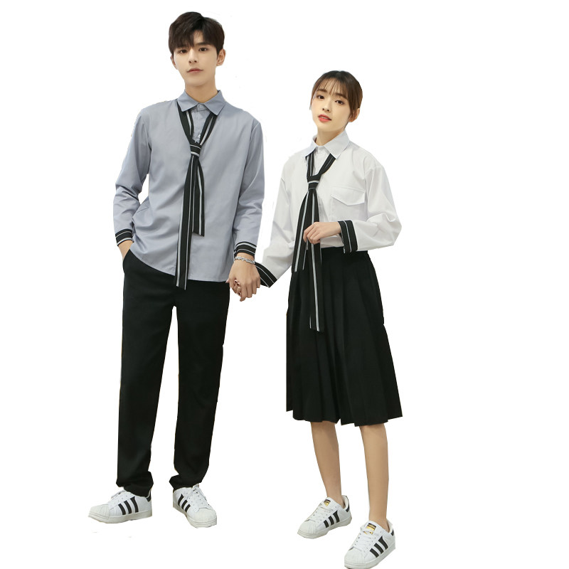 Hong Kong style women's white shirt tie Hong Kong Wind Women's gray shirt tie Hong Kong wind men's white shirt tie Hong Kong wind Men's gray shirt tie Hong Kong Wind Women's white shirt black dress