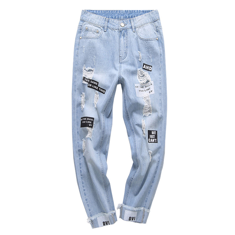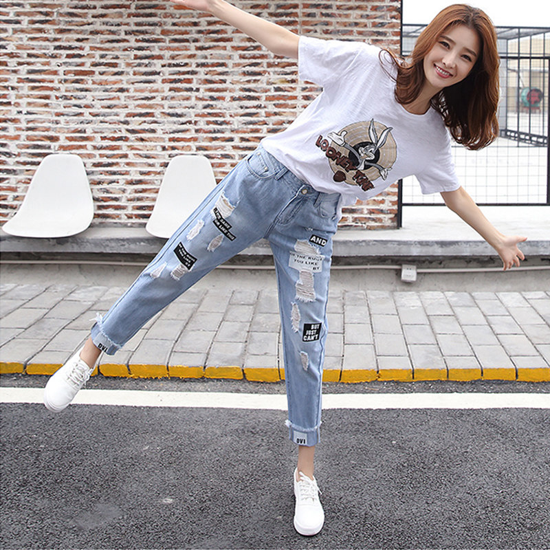 Tide brand 2023 summer ripped jeans women's ins Korean version high waist thin casual all-match small feet nine-point pants thin