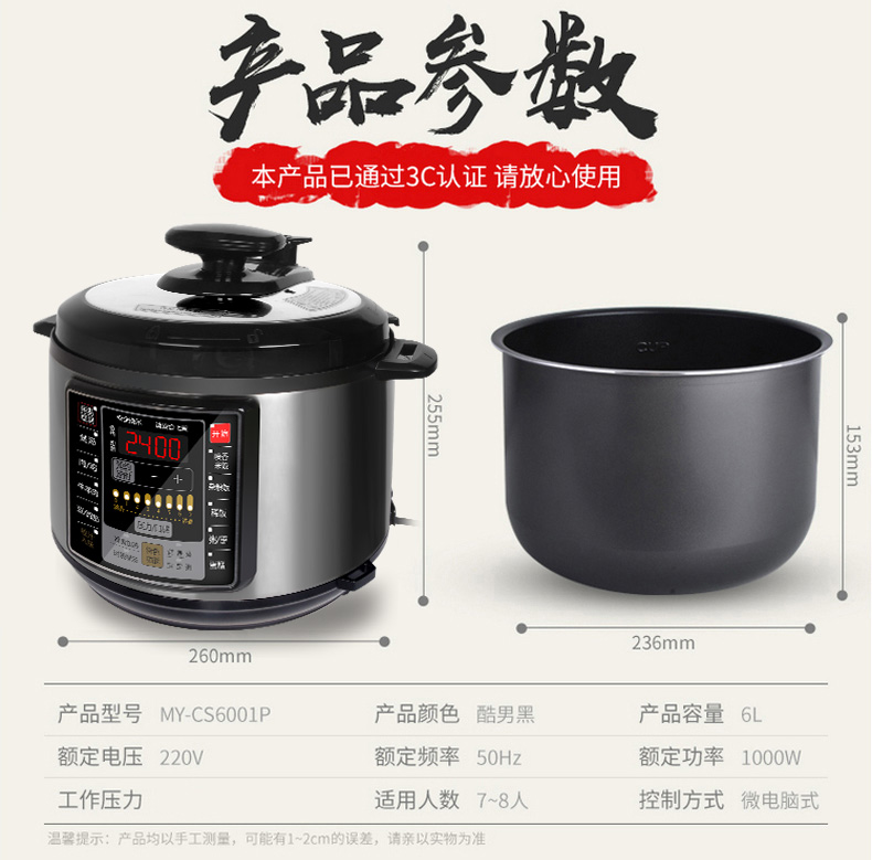 Midea electronic pressure cooker 6L household double bile timing appointment to cook soup, rice and porridge fast large-capacity PCS6001P