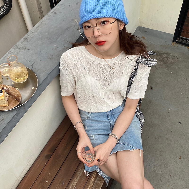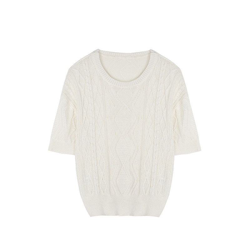 An Jiuyue Durable Anti-Pilling Hollow Knitted Shirt Women's Autumn Thin Crewneck Loose Stranded Short Sleeve Sweater