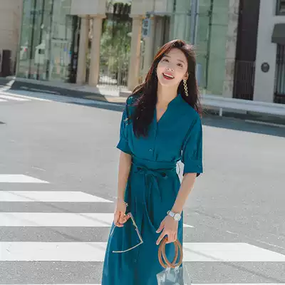 French Medium-length dress Summer 2020 new peacock blue V collar chiffon solid color dress Super fairy Korean spring and summer