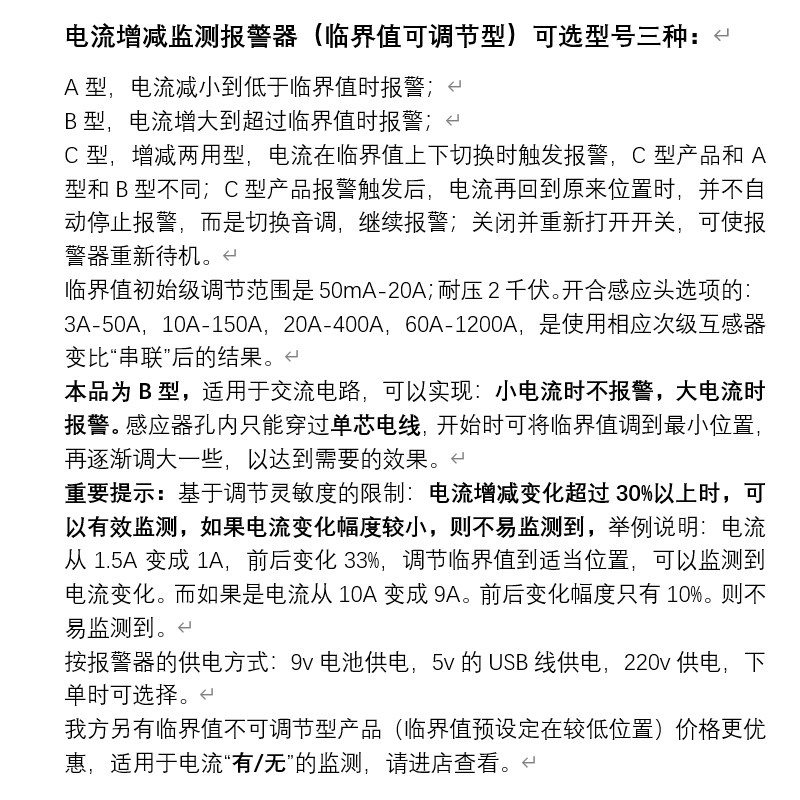 According to the power supply current range Sensor head size 9v battery powered 0 1A-20A hole inner diameter 8mm9v battery powered 3A-50A hole inner diameter 38mm9