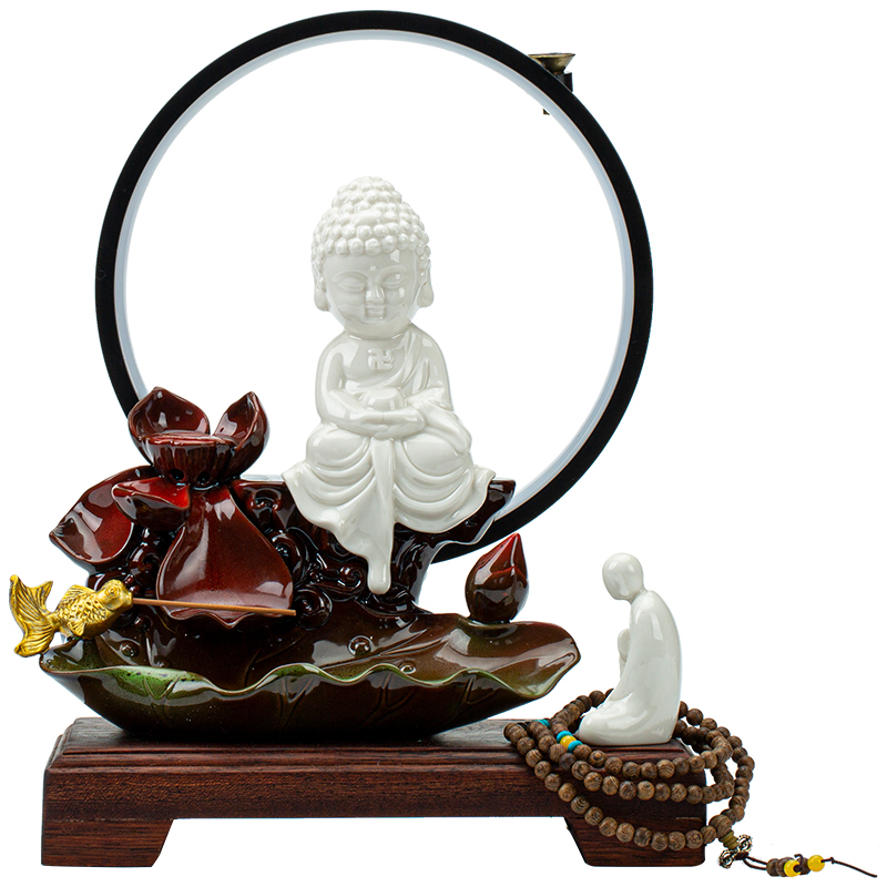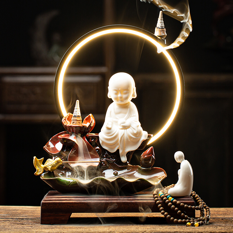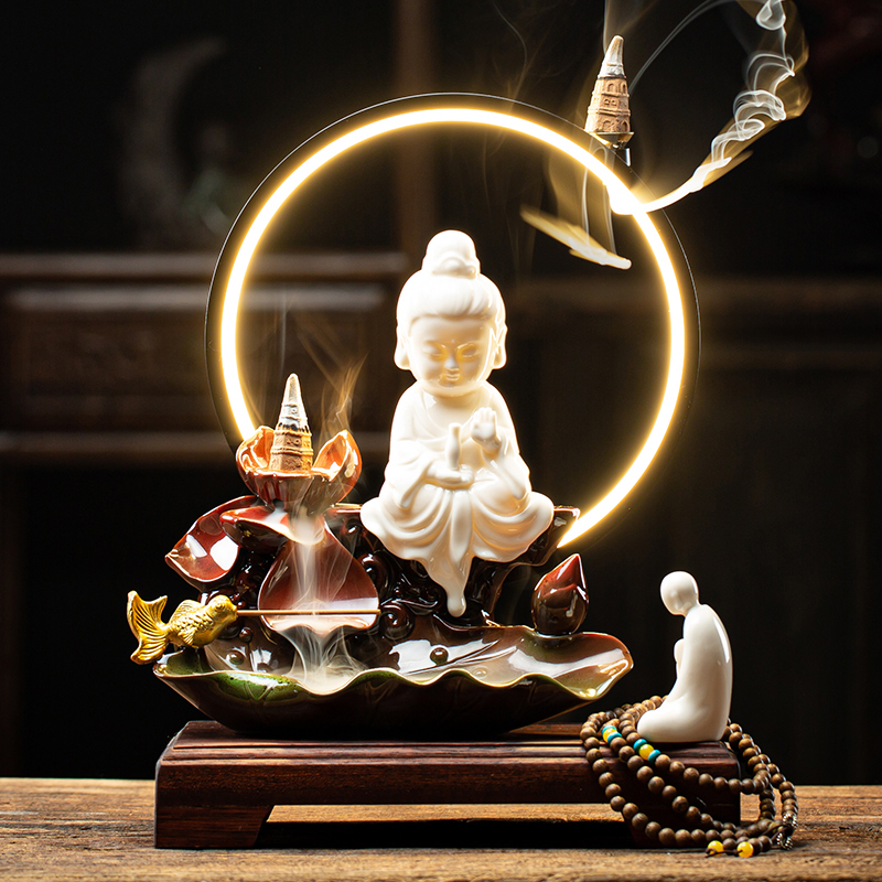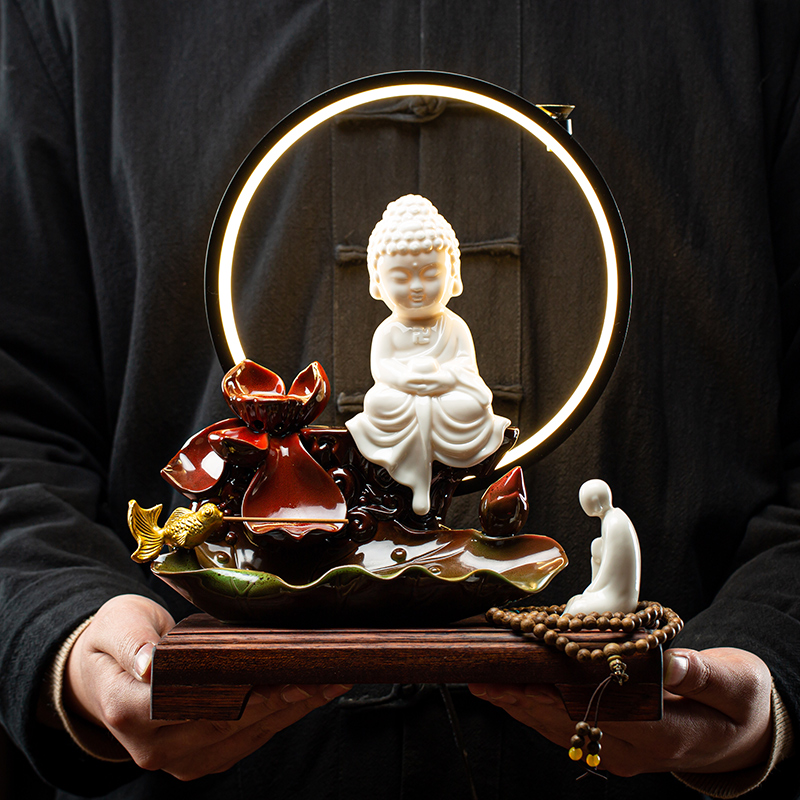 Shou Taoren New Chinese Zen LED Lamps White Porcelain Buddha Statue Ornament Creative Backflow Incense Living Room Entrance Decoration