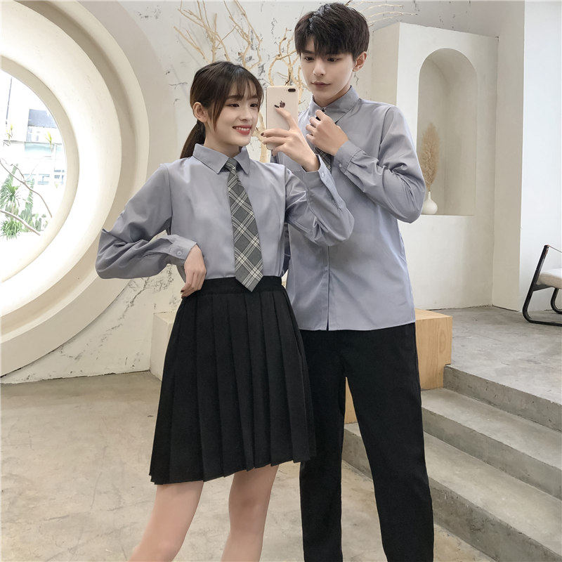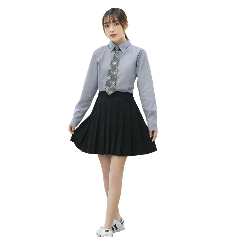 Gray short-sleeved blouse Gray collar with gray long-sleeved blouse Gray collar with gray short-sleeved blouse Gray collar with gray long-sleeved blouse Gray collar with gray short-sleeved blouse Black skirt Gray collar with gray short-sleeved blouse Black skirt Gray collar with gray short-sleeved blouse Black skirt Gray collar with gray