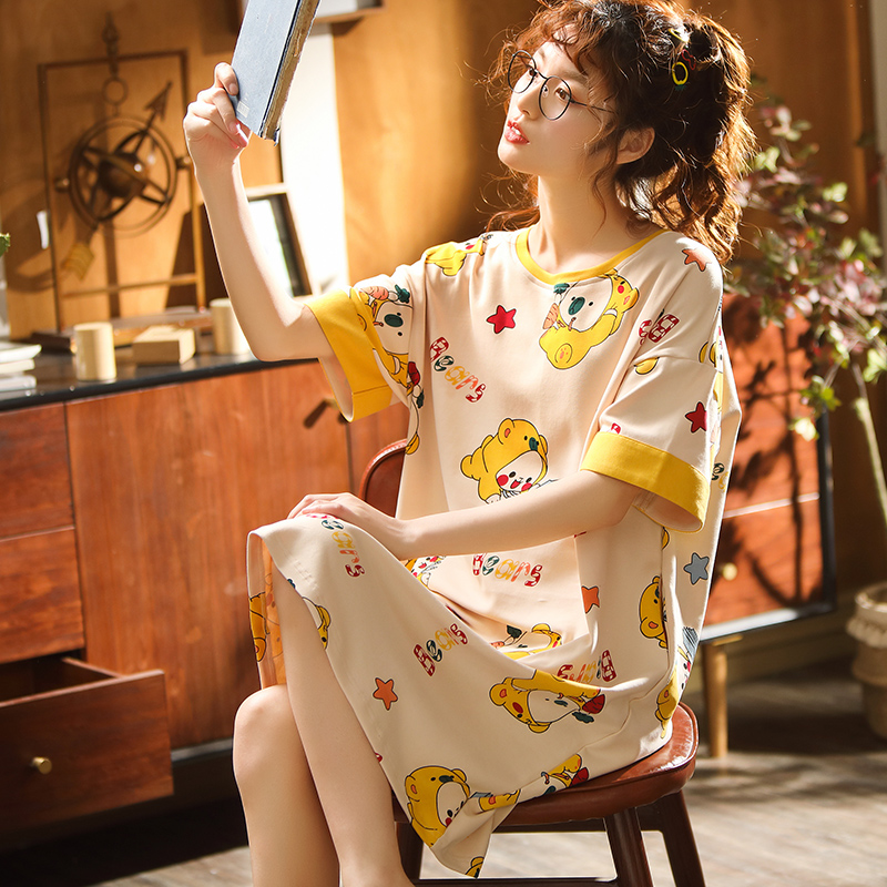 Pure Cotton Sleeping Dress Woman Summer Short Sleeve Full Cotton Pajamas Tennis Red Ins Cute Cartoon Student Home Dress Exterior Wear