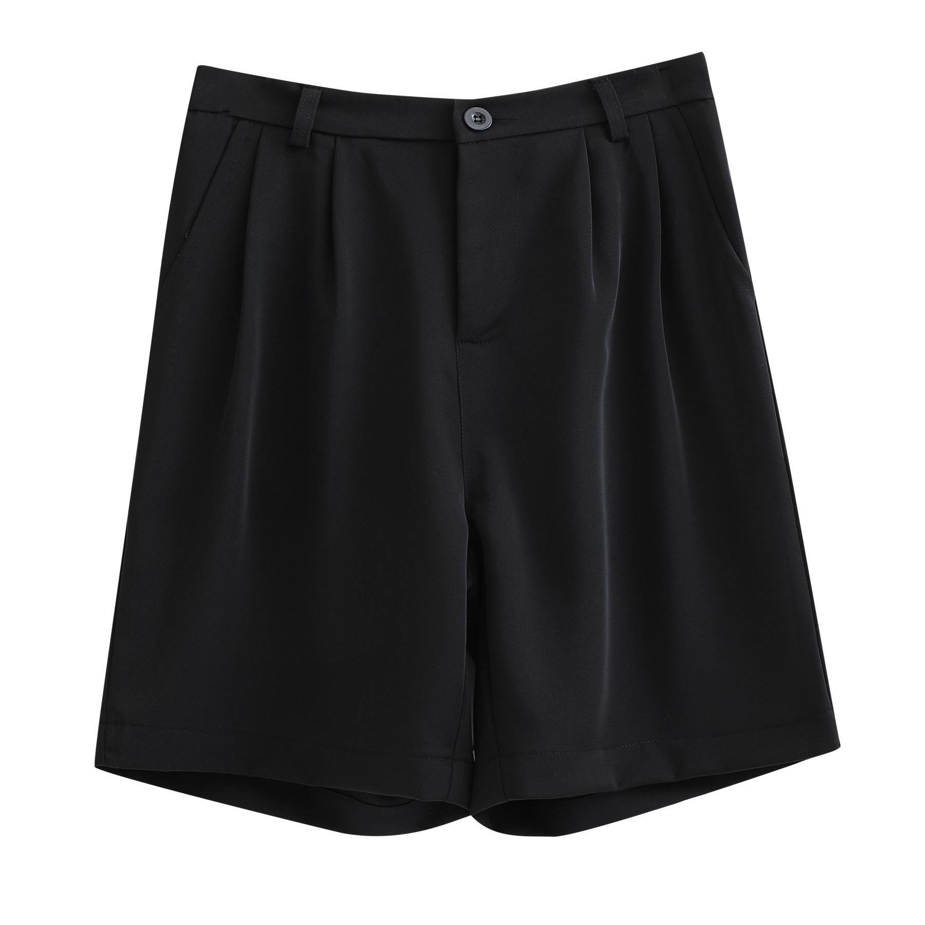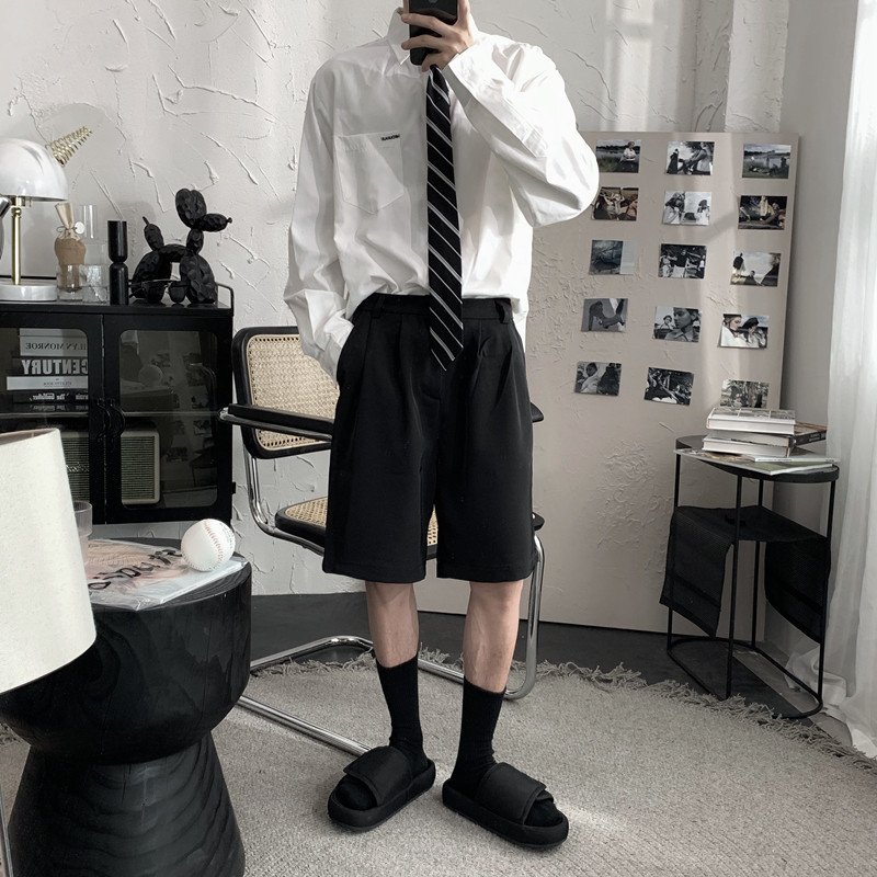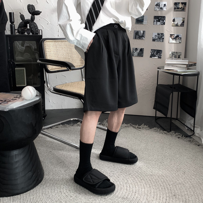 He has been wearing black casual shorts for the summer. Men's loose, straight, wide-leg pants go with five-cent pants