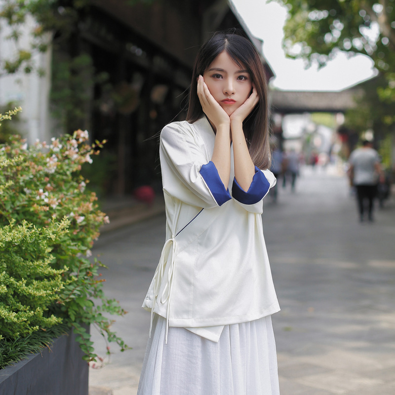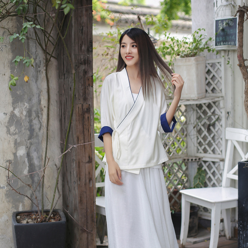 Summer Chinese style Hanfu women's top one-piece cross-collar loose three-quarter sleeve chiffon shirt thin Zen tea jacket